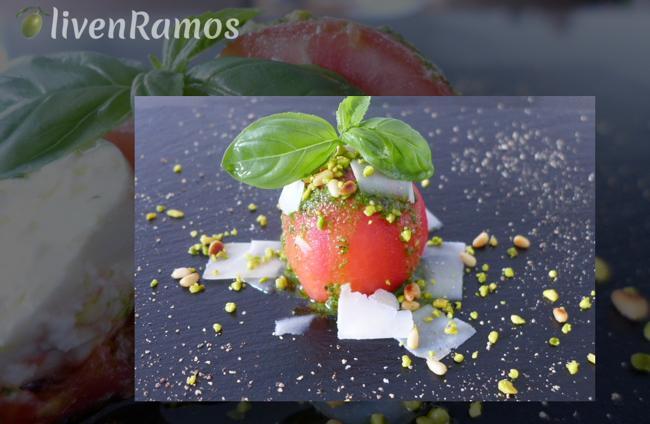 Hoje, preparamos um tomate recheado com burrata, um toque de azeite de manjericão, pinhões, pistaches e Queijo Parmesão.